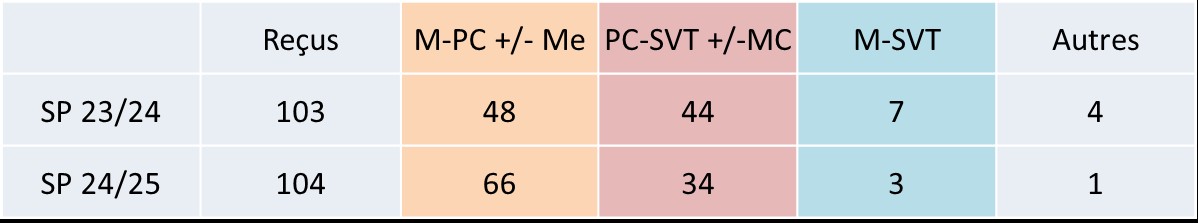 En 2024/2025, parmi nos 104 reçus (sur 196 places) :